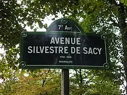 Trotz vieler weiterer Verpflichtungen, zum Beispiel in der königlichen Druckerei und an der Académie des inscriptions et belles-lettres, publizierte er weiterhin seine Forschungsergebnisse und gab sein Wissen durch unermüdliche Lehrtätigkeit in den Fächern Arabisch und Persisch weiter bis zu seinem Tod am 21. Februar des Jahres 1838 in Paris. Neben Verleihung von Ehrenmedaillen sowie Mitgliedschaften und Ehrenmitgliedschaften zu Lebzeiten, wie zum Beispiel der Légion d’honneur, der Königlichen Societät der Wissenschaften zu Göttingen, der Königlich Dänischen Akademie der Wissenschaften, der Königlich Niederländischen Akademie der Wissenschaften, der Académie royale de Bruxelles,[1] der Bayerischen Akademie der Wissenschaften, der Russischen Akademie der Wissenschaften in Sankt Petersburg, wurde 1907 eine Straße am Champs de Mars in Paris Avenue Silvestre de Sacy benannt.