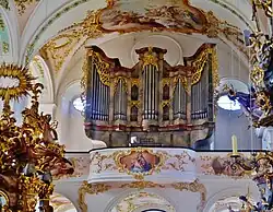II/P | 18 | Prospekt mit Engelskonzert von Christian Jorhan d. Ä.[6] 1895 Neubau von Binder und Siemann im historischen Gehäuse von 1783 1985 Neubau von Manfred Mathis im historischen Gehäuse von 1783 → Orgel |