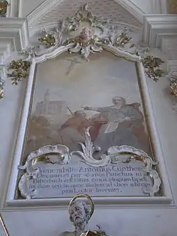 - ↑ Franz Anton Veith: Bibliotheca Augustana, complectens notitias varias de vita et scriptis eruditorum,quos Augusta Vindelica orbi litterato vel dedit vel aluit. im Eigenverlag, Augsburg 1785, Alphabetum I (in den Digitalen Sammlungen der Universitätsbibliothek Augsburg), Seite 38 ff. "(a) Cum ſermo de Antonio GINTHER inciderit, non ineptum fore cenſui, pauca de eodem annotare; ne forte Viri hujus zeloſiſſimi, tum pietate, tum eruditione & præcipue SS.Scripturarum ſcientia inſignis, memoria (ut fieri plurimum aſſolet) cum tempore penitus intereat. Natus eſt Fridbergæ oppido in limitibus Bavariæ, qua ea Sueviam reſpicit, ſito, anno a reparata ſalute MDCLV. Eum mater, graviſſimis partus doloribus correpta, omni jam humana ope deficiente, B. Antonio devovit, & divino ſervitio a ſe mancipandum fore ſpopondit. Hinc præter ſpem feliciter genito, dum ſacro fonte tinctus eſt, Antonii nomen manſit. Litteraria palæſtra, in qua ita ſe geſſit, ut voto matris adimplendo parem ſe redderet, egreſſius, ſacerditio ſuſcepto, non ita multo post parochiæ Biberbacenſi præfectus eſt. In eo munere poſitus Templum, thaumaturgo Chriſti crucifixi ſimulachro celebre, ad eam magnificentiam, qua hodiedum viſitur, non ſine maximis curis adduxit. Durante hoc ipſo opere Romam profectus, alloquio INNOCENTII XI. frui meruit, & præcipue gratia ac favore Card. MARESCHOTI, qui eundem, Sacellani ſui domeſtici honore auctum, apud ſe retinere viribus omnibus allaborabat. At Noſter, utpote nec auri nec honorum appetens, in Germaniam remeare maluit, priſtinamque repetere ſedem. In hac per 46. annos apoſtolicis laboribus, omnibusque, quæ in ſacerdotem & parochum cadunt, virtutibus egregie defunctus, poſt diutinum morbum pientiſſime vitam finiit circa annum MDCCXXIV.