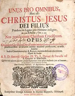 - Unus pro omnibus, hoc est: Christus Jesus dei filius pendens in ligno pro homine indigno .... Georg Schlüter und Martin Happach, Augsburg 1726, ed. 1