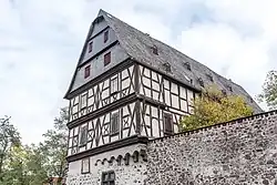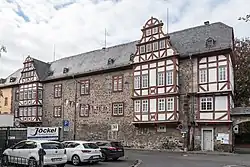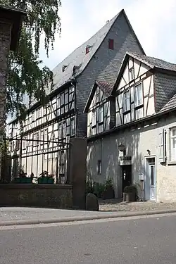 Das gegenüberliegende Gebäude auf der Südseite an der Rosengasse stellt seit dem Umbau ab 1577 den Kernbau des „Schlosses“ dar. 1569 hatte Landgraf Ludwig IV. das ehemalige Kloster zum Witwensitz seiner Gemahlin Hedwig bestimmt. 1577 bis 1582 entstand unter der Oberaufsicht des landgräflichen Baumeisters Ebert Baldewein der dreigeschossige Wohnbau auf älteren Resten.[2] Nach dem Tod Hedwigs im Jahre 1590 wurde es Witwensitz der zweiten Gemahlin Ludwigs, Maria von Mansfeld vorgesehen. 1594 erfolgte ein zweiter Umbau. Es entstand eine hölzerne Wendeltreppe in einem Anbau mit zwei vorkragenden Fachwerkobergeschossen an der östlichen Schmalseite. Ebenso die beiden zur Straße gerichteten zweigeschossigen Fachwerkerker. Diese werden von Volutengiebeln bekrönt. Der östliche Erker trägt in seiner Schwelle die Inschrift: „1594 MEISTER HANS KRAVSKOPF VON KIRCHFERS IM GERIT LORA DISEN BAV GEMACHT“. An der Hofinnenseite eingemauert steht in vertieftem Feld die Figur eines Mönchs mit dem Antoniterkreuz auf der Brust; er hält zwei Wappenschilde, das hessische und das mecklenburgische. An der Innenseite des Schlosshofs befindet sich der Grabstein des Präzeptors Conrad von Angersbach von 1477.