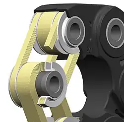 - Antriebsgelenkscheiben für reversierenden Betrieb, d. h. bei Vorwärts- und Rückwärtsbetrieb sollen die gleichen Drehmomente übertragen werden; hier werden gleich starke Fadenpakete für beide Drehrichtungen verwendet.