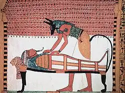 Nachdem Osiris von seinem Bruder Seth zerstückelt und auf der ganzen Welt verteilt worden war, sammelte Anubis gemeinsam mit Isis alle Körperteile wieder ein. Danach soll es ihm gelungen sein, Osiris wieder zusammenzusetzen, indem er ihn mumifizierte. So hat Anubis, dem Mythos nach, die erste Mumifizierung an einer Leiche vorgenommen. Für Osiris vollzog er dann die Totenriten, die zum Vorbild aller Bestattungszeremonien wurden.