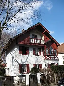 Der zweigeschossige Bau mit einer Balkonnische an der Giebelseite besitzt einen seitlichen Erker. Die Villa ist ein typisches Beispiel des heimischen Landhausstils mit hölzernen Bauteilen der Villenkolonie Pasing II.