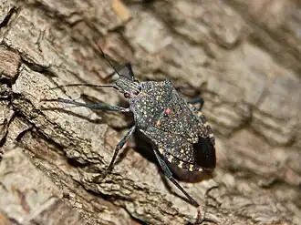 Die Wanzen werden etwa 15 Millimeter lang, wobei die Weibchen etwas größer werden als ihre männlichen Artgenossen.[1] Die graubraunen oder schwarzen Wanzen sind ockerfarben meliert.[1] Mittig auf dem Kopfschild verläuft eine ockerfarbene Strichzeichnung.[1] Das Connexivum (auf der Seite sichtbarer Teil des Abdomens) ist schwarz-ockerfarben gescheckt.[1] Beine und Fühler sind graubraun bis schwarz gefärbt.[1]