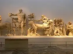 Im Westgiebel des Zeustempels von Olympia war der Kampf der Lapithen gegen die Kentauren (Kentauromachie) bei der Hochzeit des Peirithoos dargestellt. Die Kentauren waren in der griechischen Mythologie wilde Waldbewohner mit Pferdeleib und menschlichem Oberkörper. Der Kampf der Lapithen, einem mythischen Volk Thessaliens, gegen die Kentauren diente häufig als Sinnbild der Auseinandersetzung zwischen Griechen und Barbaren. Die meisten Figuren dieser reich bewegten Kampfdarstellung wurden bei den deutschen Ausgrabungen in Olympia seit 1875 unter Georg Treu wiedergefunden.