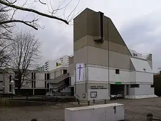 Die Kirchengemeinde, die den Apostel Johannes zum Namenspatron wählte, wurde erst 1972 von der Apostel-Petrus-Gemeinde abgetrennt. Ihr Gemeindezentrum wurde geplant, bevor die Gemeinde selbst existierte. Das architektonisch anspruchsvolle Bauwerk markiert den Höhepunkt des damaligen Enthusiasmus für Beton, sogar der Altar ist betoniert. Die Errichtung dieses Massivbaus erfolgte in den Jahren 1970–1971 und fällt somit in die Aufbauphase der Trabantenstadt, die durch bis zu 18-geschossige Hochhäuser aus Betonfertigteilen geprägt ist.