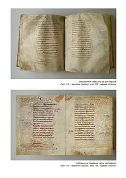 Der Entstehungsort ist unbekannt. Das Manuskript wurde im 19. Jahrhundert in Krystynopol (heute Tscherwonohrad) gefunden. 291 Blätter befinden sich heute im Historischen Museum in Lwiw (Signatur MS 37), 8 Blätter in der Ukrainischen Nationalbibliothek in Kiew (MS VIII.3).