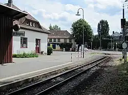 November 1989 am Straßenübergang der Lößnitzgrundbahn über die Meißner Straße mit ihren Straßenbahngleisen