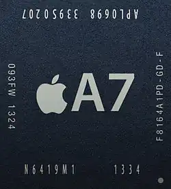 Der Apple A7 ist ein von dem US-amerikanischen Unternehmen Apple Inc. entwickelter und vom südkoreanischen Unternehmen Samsung Electronics gefertigtes System-on-a-Chip (SoC).[1] Er kombiniert eine 64-Bit-Arm-CPU mit einem Grafikprozessor und Hauptspeicher und übernimmt zudem die Funktionen eines herkömmlichen PC-Chipsatzes. Er gehört zu den S5L SoCs.