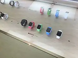 Die Apple Watch der 1. Generation war in drei Modellen erhältlich: ein reguläres („Apple Watch“) aus Edelstahl und Saphirglas, ein leichteres und stabileres für Sport und Fitness („Apple Watch Sport“) aus Aluminium und gehärtetem Glas, sowie ein Modell aus 18-karätigem Gelb- oder Roségold und Saphirglas („Apple Watch Edition“). In Kooperation mit dem Sportartikelhersteller Nike und dem Luxus-Modehersteller Hermès erschienen weitere Ableger der Apple Watch, die sich jeweils durch exklusive Ziffernblätter und Armbänder von den anderen Modellen unterscheiden.[17][18] Jedes Modell gibt es in zwei verschiedenen Größen (38 und 42 mm, gemessen an der Höhe).[19][20] Zudem gibt es sechs verschiedene Armbänder aus Leder, Kunststoff und Metall.[20] Das 38-mm-Display hat 272 × 340 Pixel Auflösung und das 42-mm-Modell 312 × 390 Pixel. Die Seitenverhältnisse der Displays sind demnach 4:5.[21] Das Ion-X-Display der Apple Watch Sport kann mit einem sehr scharfen und harten Material beschädigt werden, wogegen die Apple Watch mit Saphirglas stärksten Einwirkungen standhält.[22]