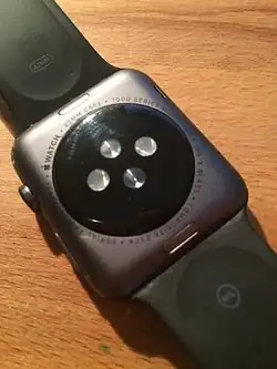 Die Apple Watch hat Sensoren zur Messung der Herzfrequenz sowie einen Lage- und Beschleunigungssensor, der Bewegungen erkennt und so unter anderem für Fitnessapps zu nutzen ist.[4] Sie kann unter anderem bevorstehende Termine oder eingehende Nachrichten anzeigen. Seit März 2015 unterstützen Apps für das iPhone von Drittanbietern im App Store auch die Apple Watch. Mit einem NFC-Chip wird Apple Pay unterstützt.[5] Das Betriebssystem bezeichnet Apple seit der Vorstellung der Version 2.0 bei der WWDC 2015 am 8. Juni 2015 als watchOS, statt wie bisher als Watch OS.[6]