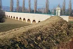 800 m nördlich der Querung des Hauptbettes der Triesting überfährt, ebenfalls auf dem Gemeindegebiet von Leobersdorf, die Hochquellenwasserleitung den von der Gemeinde Leobersdorf nach 1846 begonnenen[2] und erst zwischen 1924 und 1930 fertiggestellten Triestinghochwassergraben, der durch ein auf dem Gemeindegebiet von Enzesfeld erbautes Teilungswerk (Schleuse) reguliert wird.[3] Der zweibogige Aquädukt (