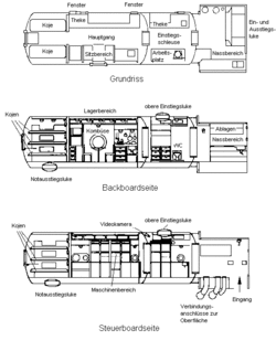 Eine weitere luftdichte Luke verbindet die Einstiegsschleuse mit dem Hauptbereich. Er ist in einen Arbeits- und einen Wohnbereich sowie einen Schlafbereich mit sechs 60 cm breiten und 1,90 m langen Kojen aufgeteilt. Des Weiteren gibt es dort einen Esstisch mit Bänken, eine Kombüse mit Spülbecken, Mikrowellenherd und Stauraum für Nahrung sowie Kommunikations- und Videoausrüstungen, medizinische Ausrüstungen und Lebenserhaltungssysteme.