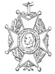 Das Ordenszeichen ist ein silbernes, blau emailliertes Malteserkreuz mit kleinen Kügelchen auf den Kreuzspitzen. Unter den Kreuzarmen ein Kranz, der aus Palmen- (links) und Lorbeerzweigen (rechts) gebildet ist. Im Medaillon der nach rechts blickenden Kopf des Marschalls Philippe Pétain mit der Umschrift PHILIPPE PÉTAIN MARÈCHAL DE FRANCE - CHEF DE l´ÉTAT.. Im Revers das Wappen des Regimes, ein aus einem Marschallstab und zwei Franziska gebildetes Emblem mit der umlaufenden Inschrift ORDRE NATIONAL DU TRAVAIL.