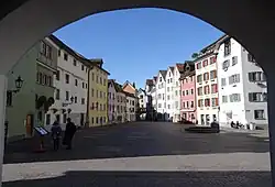 Das mit Churer Familienwappen und Wandmalereien gezierte Haus am Martinsplatz als Bindeglied zwischen Arcas und Martinsplatz – hier vom Arcas aus gesehen