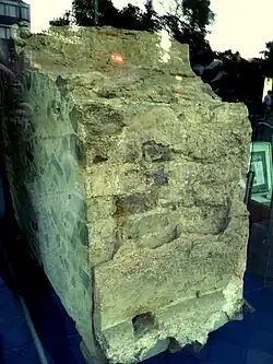- Aachener Rathaus (Standort) An der linken Rathausseite direkt neben dem Eingang zum Ratskeller sind in einem Fenster Abschnitte der karolingischen Grundmauern des Rathauses zu sehen, die um das Jahr 800 gefertigt wurden. Auch die Wiederverwendung älterer Steine wie einen römischen Grabstein ist zu erkennen. Der noch vorhandene Mörtel ist durch Ziegelmehl rötlich gefärbt. Das Ziegelmehl wurde dem Mörtel zugemischt, um eine bessere Stabilität zu gewährleisten.