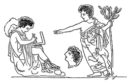 Das abgeschlagene Haupt des Orpheus als Orakel auf Lesbos; Nachzeichnung (1877) eines attischen Vasenmotives des 5. vorchristlichen Jahrhunderts, rechts der Gott Apollo, der seine Arme segnend über das Haupt breitet