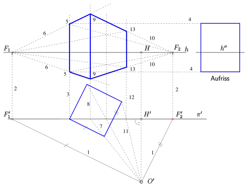 Im Beispiel (s. Bild) sind Grund- und Aufriss eines Quaders sowie der Grundriss der Bildtafel und des Augpunktes gegeben. Im Aufriss ist die Höhe des Augpunktes durch den Aufriss des Horizonts festgelegt.