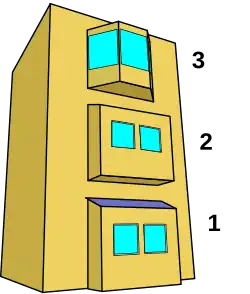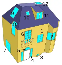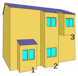 - Auch Zwerchgiebel: Ein mit einem Giebel und einem eigenen Dach ausgestatteter Aufbau auf einem geneigten Dach, der – anders als eine Gaube – in der Flucht der Gebäudeaußenwand steht.