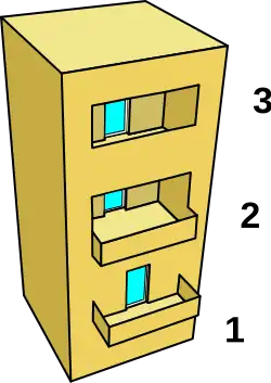- Eine Gebäudeerschließung, bei der zwei Wohnungen über einen Flur an ein Treppenhaus angeschlossen sind.