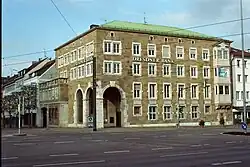Der gemäßigten Moderne aus der Vorkriegszeit stand die avantgardistische Architektur der Moderne ab 1920 gegenüber, die ein Übermaß an Geschichtlichkeit ablehnte und sich von der Architektur der Vorkriegszeit abwandte.[59] Bis Mitte der 1920er Jahre konnte der damalige Oberbürgermeister und Architekt Emil Beutinger den Ausbau des Neckars als Großschifffahrtsweg vorantreiben. Es entstanden dabei 1926 elf Staustufen. Diese als funktionale, markante Betonbauwerke[60] beschriebenen Bauten waren im Stil des Funktionalismus[61] von Paul Bonatz errichtet worden. Ebenso nahm Paul Bonatz mit der Gestaltung des Hafenmarktturms in den Jahren 1929 und 1936 die moderne Architektur des Funktionalismus auf, als er dort das Kriegerdenkmal, eine Gedenkstätte für die Toten des Ersten Weltkriegs schuf.[62] Karl Elsäßer nahm sich die Architektur des Paul Bonatz zum Vorbild, als er im Jahre 1938 das Kaiser’s Kaffeegeschäft entwarf.[63] Der Funktionalismus war dabei eine Stilrichtung der modernen Architektur, die die äußere Form der Gebäude aus der Funktion ableitete.[64]