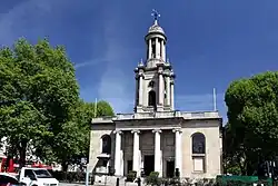In der georgianischen Zeit wurden viele bürgerliche, kommerzielle und religiöse Gebäude errichtet. Kirchen aus der georgianischen Zeit waren noch immer sehr stark von den Entwürfen von Christopher Wren beeinflusst, der mit seinen Stadtkirchen in England Pionierarbeit bei der Verwendung klassischer Architektur bei der Kirchengestaltung geleistet hatte. Doch mit der abnehmenden Beliebtheit des Barockstils verfolgte die Kirchengestaltung im georgianischen Stil einen zurückhaltenderen palladianischen Ansatz als Wren. St Martin-in-the-Fields (1722) von James Gibbs ist eine archetypische Kirche dieser Zeit, eine einfache neoklassizistische „Tempelkirche“ mit zurückhaltenden palladianischen Ornamenten an der Außenseite und einem hohen Turm, der an die Stadtkirchen von Wren erinnert.[44] Sein Format wurde in ganz England und im Ausland vielfach kopiert. Gibbs‘ St. Peter, Vere Street (1722) ist ein weiterer Indikator für die zunehmende Einfachheit der Kirchengestaltung im 18. Jahrhundert.