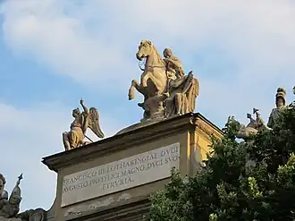 Der Triumphbogen hat drei Durchfahrten, von denen die mittlere die größte ist. Dem eigentlich Gebäude vorgelagert stehen insgesamt 10 korinthische Säulen. Sie tragen auf höhe der Attika allegorische Figuren. Die Fassade ist mit Relief- und Schrifttafeln sowie Trophäen und doppelköpfigen Reichsadlern verziert. Diese unterstreichen die Funktion als Ehrenmal für einen Herrscher aus dem Hause Habsburg-Lothringen. Ein markantes Merkmal befindet sich auf der Attika: über der mittleren Durchfahrt steht auf einem Sockel ein stadtauswärts blickendes Reiterstandbild von Herzog Franz II.