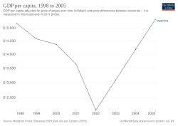 Argentinien, das in der ersten Hälfte des 20. Jahrhunderts zu den reichsten Ländern der Welt gehört hatte (1913 lag das Pro-Kopf-Einkommen auf dem Niveau Frankreichs und Deutschlands[1]), hatte seit der Absetzung von Juan Perón im Jahr 1955 eine sowohl politisch als auch wirtschaftlich instabile Phase durchgemacht. Es kam zu häufigen Regierungswechseln, die sich auch in einer Wirtschaftspolitik mit stark wechselnden Ideologien niederschlugen. Die Folge waren zahlreiche Wirtschaftskrisen, die wiederum zu kurzfristig angelegten Stabilisierungsprogrammen führten, die jedoch die instabile Situation meist noch verschärften und hohe soziale Kosten (s. externer Effekt) verursachten, insbesondere durch eine hohe Inflationsrate der Landeswährung Peso. Oft wurde und wird von einem langsamen Abstieg Argentiniens von der ersten in die dritte Welt gesprochen.