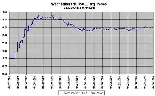 1991 hatte der damalige Wirtschaftsminister Domingo Cavallo zunächst den Austral, dann, nach dessen Einführung, den Peso an den US-Dollar gekoppelt. Der fixe Wechselkurs betrug 10.000 Austral je US-Dollar bzw. 1 Peso je US-Dollar. Diese Maßnahme führte zunächst zu einem erfolgreichen Rückgang der Inflation, die während der Hyperinflationskrise 1989 dreistellige Werte im Monat erreicht hatte. Dennoch blieb eine ein- bis zweistellige Restinflation erhalten, die die argentinischen Exporte auf dem Weltmarkt verteuerte. Dies führte vor allem in der zweiten Hälfte der 1990er Jahre zu einer Importschwemme und einer negativen Handelsbilanz, die durch Neuverschuldung (s. Haushaltssaldo) ausgeglichen werden musste. Heute wird kritisiert, dass Argentinien die 1:1-Parität möglichst noch vor 1998 durch einen flexiblen Wechselkursmechanismus hätte ersetzen sollen, wodurch die Krise wohl nicht so drastisch ausgefallen wäre. Verschärft wurde dieser Effekt noch durch den starken Dollar Ende der 90er Jahre.[5]