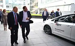 Arkadi Wolosch demonstriert Wladimir Putin 2017 im Yandex-Hauptquartier den Yandex-Prototyp eines fahrerlosen Autos