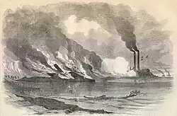 Zu dieser Zeit hatte die Marine der Nordstaaten eine Flussblockade über Vicksburg verhängt, die von Captain Brown unbedingt durchbrochen werden sollte. Nach einer Fahrt von ca. 15 Meilen stellte sich heraus, dass Dampf aus dem Kessel in den vorderen Munitionsraum eingedrungen war, wodurch das Schwarzpulver nass und schließlich unbrauchbar wurde.[5] Daraufhin steuerte die Crew eine Lichtung am Ufer des Yazoo-Flusses an, wo das Pulver bis Sonnenaufgang getrocknet werden konnte. Unmittelbar danach wurden drei Schiffe der Nordstaaten gesichtet, die auf die Arkansas Kurs nahmen. Es waren die Carondolet, die Tyler und die Queen of the West. Die drei Schiffe nahmen umgehend die Verfolgung der ablaufenden Arkansas, was dann zu einem offenen Gefecht führte, in dem die Arkansas ihren ersten Erfolg verzeichnen konnte. Sie versenkte die Carondolet zu Beginn des Gefechts mit einem Treffer in die Steuerung und konzentrierte sich dann auf die Tyler und die Queen of the West. Diese ergriffen die Flucht und lockten die sie verfolgende Arkansas vor die Rohre einer Flotte von mehr als 20 Kriegsschiffen der Nordstaaten. Trotzdem entschloss sich Kapitän Brown den Durchbruch zu wagen, was ihm mit Hilfe des Überraschungsmoments auch gelang.