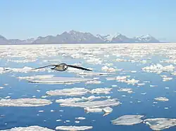 Der Arktische Ozean hat eine Ausdehnung von rund 14,09 Millionen km² und ist großflächig von Eis bedeckt. Dabei nimmt die Eisbedeckung mit den Jahreszeiten zu und ab. Insgesamt hat die Eisfläche seit den 1970er Jahren deutlich abgenommen.[4] Während die spät-sommerliche Eisbedeckung im September in den 1980er Jahren noch zwischen 6 und 7 Millionen km² betrug, beträgt diese in den 2010er Jahren nur noch durchschnittlich 4,13 Millionen km².[5][6] Mitte September 2020 lag dieser Wert bei 3,8 Millionen km².[7]