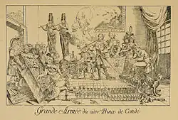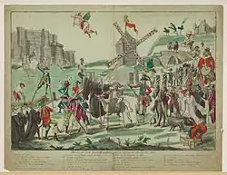 Anonyme Karikatur von 1791. Verhöhnung des Prince de Condé als Don Quichotte zusammen mit dem Vicomte de Mirabeau (Mirabeau Tonneau) und Sancho Panza, welche eine konterrevolutionäre Armee zur Verteidigung der Mühle des übermäßigen Genusses, die von einer Büste von Louis XVI. gekrönt ist, anführen.