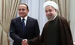 Die Beziehungen zwischen der Republik Armenien und der Islamischen Republik Iran sind sehr eng. Die beiden Staaten haben seit Armeniens Unabhängigkeit keine Grenz-, ethnischen, religiösen oder wirtschaftlichen Konflikte ausgetragen.[1] Sie werden häufig auf einer Achse Moskau-Jerewan-Teheran gesehen. Für Armenien und Iran sind die beiderseitigen Beziehungen wichtig, um den Einfluss der Türkei im Südkaukasus zu begrenzen und um ihre Isolation zu vermindern. Für Armenien sind die Beziehungen zu Iran darüber hinaus von Bedeutung, um nicht in eine zu starke Abhängigkeit von Moskau zu geraten.
