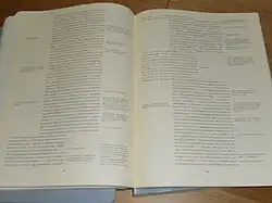 Doch auch auf das eigene Schaffen wandte Schmidt die Etym-Theorie an: Er behauptete, Schriftsteller in höherem Alter könnten zu dieser Sprache des Unbewussten Zugang erlangen und sie gestalten, weil das Über-Ich geschwächt sei – das Es könne wegen der einsetzenden Impotenz seine Triebansprüche ja ohnehin nicht mehr umsetzen. Aus dieser Konstellation ergebe sich eine zusätzliche vierte Instanz seelischen Geschehens: den genialen Schriftsteller, der über die Etyms die Sprache des Unbewussten beherrsche und der Reflexion des Ichs zugänglich mache.[51] Diesen Gedanken erläuterte und veranschaulichte Schmidt in seinem Monumentalwerk Zettel’s Traum, wo er die bereits zuvor erprobte Mehrspaltigkeit des Textes noch ausbaute: Nun gibt es drei Spalten, von denen die mittlere das reale Tun, Erleben und Reden der Figuren des Romans darstellt, die linke Zitate aus den Werken Edgar Allan Poes bietet, die die Figuren des Romanes gerade im Kopf haben, und die rechte die Etyms, das heißt die persönlichen Einfälle, Assoziationen und Gedankenspiele des Protagonisten Pagenstecher. Dieses Schriftbild ließ sich mit den damaligen technischen Mitteln nicht mehr satztechnisch realisieren, weshalb der Roman als photomechanische Kopie der 1330 DIN-A3-Seiten des Typoskripts veröffentlicht wurde. Erst 2010 brachte der Suhrkamp Verlag eine gesetzte Ausgabe auf den Markt. Den Satz hatte in mehrjähriger Arbeit Friedrich Forssman erstellt.
