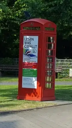 - Ein öffentlicher Bücherschrank in der Form einer typisch roten englischen Telefonzelle. Hier können eigenverantwortlich und kostenlos Bücher ausgeliehen, abgegeben und getauscht werden.