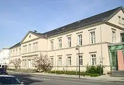 Im Jahr 1794 wurde Arnsberg Zufluchtsort des vor den Truppen der französischen Republik auf die rechtsrheinische Seite geflohenen Kölner Domkapitels. Auch Teile des Kölner Domschatzes, insbesondere der Dreikönigenschrein, wurden bis 1804 im Kloster Wedinghausen aufbewahrt. Das Domkapitel wählte dort 1801 den österreichischen Erzherzog Anton-Viktor zum neuen Erzbischof und letzten Kurfürsten. Politisch spielte diese Wahl aber schon keine Rolle mehr.[14] Im Zuge der Auflösung des Alten Reiches und des Endes der geistlichen Staaten (→ Säkularisation) fiel das Herzogtum Westfalen mit der Stadt Arnsberg im Jahr 1802 an die Landgrafschaft Hessen-Darmstadt. In dieser Zeit war Arnsberg Garnisons- und Regierungsstadt. Zusammen mit dem ehemaligen Herzogtum Westfalen fiel die Stadt dann 1816 nach der napoleonischen Epoche und dem Wiener Kongress an Preußen. Seither gehörte sie zur Provinz Westfalen. Sie wurde Kreisstadt und Sitz des Regierungspräsidenten von Arnsberg. Bereits in der hessen-darmstädtischen Zeit begann eine deutliche Zunahme der Bevölkerung. Dies machte eine Ausweitung des Stadtgebiets nötig. In dieser Zeit begann die Bebauung der heutigen Jäger- und Bergstraße. Dadurch entstanden etwa 32 neue Häuser.