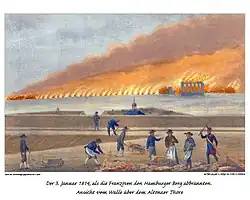 Hamburg wurde auf Anweisung Napoleons unter Marschall Davout zur Festung ausgebaut. Ein Großteil der männlichen Bevölkerung wurde dazu als Zwangsmaßnahme zu Schanzarbeiten herangezogen. Vor den Toren der Stadt, auf dem Hamburger Berg, in Pöseldorf, Hamm, am Rothenbaum, vor dem Dammtor und in Teilen von St. Georg wurden zugunsten eines freien Schussfeldes die Häuser abgerissen, alle Bäume gefällt und die Gärten verwüstet. Die Bevölkerung wurde gezwungen, in Minuten ihre Häuser und ihren Besitz zurückzulassen und in Nachbarorten unterzukommen oder im Freien zu kampieren. Allein in St. Pauli wurden mitten im Winter so 900 Häuser, Buden, die Kirche sowie der Krankenhof mit 800 Kranken zerstört. Zwei Drittel der Kranken, die größtenteils in der Johanniskirche in Eppendorf untergebracht wurden, überlebten diese Umquartierung nicht.[5][7] Die Hauptkirchen außer St. Michaelis[8] wurden zu Pferdeställen umfunktioniert. Zur weiteren Strafe für seinen Abfall wurde Hamburg eine Buße von 48 Millionen Franc auferlegt und deshalb das Silberdepot der Hamburger Bank im Wert von 7½ Millionen Mark Banco beschlagnahmt. Napoleon wird der Ausspruch zugeschrieben: „Ich ziehe es vor, die Hamburger zahlen zu lassen. Das ist die beste Art, Kaufleute zu bestrafen.“ In Hamburg brach daraufhin die Geldwirtschaft zusammen und es verlor seine Kreditwürdigkeit.[5] Der Wiederaufbau ab 1814 nahm mehrere Jahre in Anspruch.