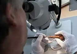 Untersuchung eines ergrabenen Artefakts, hier der verzierte Knochengriff eines Messers im Niedersächsischen Landesamt für Denkmalpflege