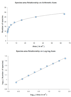 Typisch ist eine zunächst steil ansteigende Art-Areal-Kurve, die dann zunehmend flacher wird. Geeignet logarithmierte Darstellungen von Art-Areal-Kurven sind oft näherungsweise eine Gerade – der Zusammenhang zwischen den beiden Größen lässt sich also durch eine Potenzfunktion beschreiben.[3] In Gleichungsform, mit Artenzahl S, Flächeninhalt A und Konstanten c und z < 1, meist:[4]