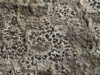 Arthonia radiata, die Typusart der Gattung, auf der Borke einer Rotbuche | ||||||||||||