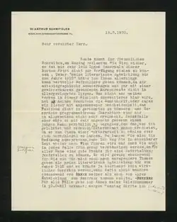 Schnitzlers Handschrift galt bereits bei seinen Freunden als schwer entzifferbar. Dabei bemühte er sich, leserlicher zu schreiben, als er das etwa in seinen Werkmanuskripten tat.[6] So liest Beer-Hofmann einmal „Gigarl“ (Geck) anstelle von „Gigant“[7], einen weiteren Brief hat er „mehr errathen als gelesen“.[8] An anderer Stelle fordert er Schnitzler auf, „deutlicher schreiben!“[9] Otto Brahm kritisiert in einem Brief vom 17. September 1905: „Was Sie mir über Reinhardt freundlichst anvertrauen, wird umso mehr ‚unter uns‘ bleiben, als ich es nur zum Teil entziffern konnte“.[10] Und Thomas Mann gelingt es nicht, Schnitzler an die Urlaubsadresse zu schreiben: „Ich schreibe Ihnen nochmals unter Ihrer Wiener Adresse, weil es mir vollkommen unmöglich ist, die ländliche zu entziffern, – woran wohl noch mehr als Ihre Handschrift meine mangelhaften geographischen Kenntnisse schuld sind.“[11]