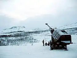 Als Geschütz kommt eine abgeänderte Ausführung der 155-mm-Haubitze FH 77B05 mit 52 Kaliberlängen (L/52), eine Weiterentwicklung der Fälthaubits 77 (FH-77), zum Einsatz.[7] Er entspricht dem Joint Ballistics Memorandum of Understanding für 155-mm-Munition. Das Geschützrohr besteht aus hochfestem Stahl und ist durchgehend autofrettiert. Es verfügt über 48 Züge. Die Ladungskammer hat ein Volumen von 25 Litern und verfügt über einen Schraubenverschluss.[8] Bei der Rohrwiege sind am Geschützrohr zwei hydropneumatische Rohrbremsen und Rückholeinrichtungen montiert. An dem Geschützende sind eine automatische Ladevorrichtung sowie ein Magazin für 21 Geschosse und deren Treibladungen angebracht. Die vollautomatische Ladevorrichtung führt die Geschosse zu und setzt sie im Rohr an. Danach werden die Treibladungen und Treibladungsanzünder geladen und zugeführt. Der Seitenrichtbereich beträgt in Fahrrichtung ±85°.[1] Der Höhenrichtbereich liegt bei −1° bis +70°.[1] Am Fahrzeugheck werden vor der Schussabgabe zwei Erdsporne abgesenkt, welche die Rückstoßkraft in das Erdreich ableiten.[2] Zusätzlich wird der Rückstoß durch eine Einkammer-Mündungsbremse gemindert.[6]