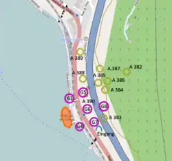 - zwei Panzerabwehrgeschütze auf Pivotlafette (G3 Nord, G4 Süd, auf der Schlossseite entlang des Bahngeleises)