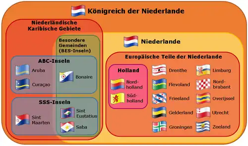 Das Königreich der Niederlande ist aus dem Kolonialreich der Niederlande entstanden. Nach der Unabhängigkeit Indonesiens 1949 umfasste dies noch Suriname in Südamerika sowie die karibischen Inseln, die damals als Niederländische Antillen zusammengefasst waren. Suriname wurde 1975 unabhängig, während die Niederländischen Antillen im Jahr 2010 aufgelöst wurden (Aruba wurde schon 1986 ein eigenständiges Land).