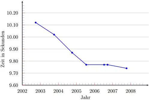 | 9,95 | 0,0 | 16. Aug. 2008 | Peking, Nationalstadion (XXIX. Olympischen Spiele) |