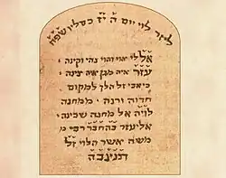 „Darüber weine ich, und vergießet Tränen mein Auge, über den Tod meines Sohnes Ascher, der am Sonntag, den 25. Kislev 435 (1674) gestorben ist, und er hinterließ einen Sohn namens Simchah nach dem Namen meines Vaters z. A. Gott möge eine Trennung machen zwischen den Toten und den Lebenden!“[7]