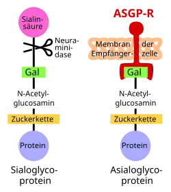 Werden durch enzymatische Aktivität einer Neuraminidase im Blut Sialinsäure-Reste von Oligosaccharidketten von Zellwandproteinen (bzw. Glykoproteinen im Blutserum) abgespalten, wird dadurch die jetzt freie Oligosaccharidkette endständig. Asialoglykoproteinrezeptoren in der Zellwand erkennen die Galaktosereste und binden sie. Anschließend werden so markierte Zellen in Vesikel verpackt und der Endozytose (Zellverdauung) zugeführt. Dieser Vorgang wird Rezeptor-vermittelte Endozytose genannt.