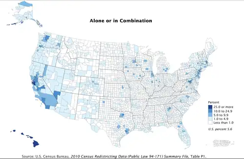 Im Jahre 2010 lebten etwa 17 Millionen sogenannte „Asian Americans“ in den Vereinigten Staaten. Die größte Gruppe bilden die Chinesen (3,7 Mio.), gefolgt von den Filipinos (3,4 Mio.) und den Indern (Desi) (3,1 Mio.). Die Mehrheit von ihnen lebt in Großstädten. Etwa 50 % der asiatischen Amerikaner lebt auf Hawaii und an der Westküste Amerikas.[3]